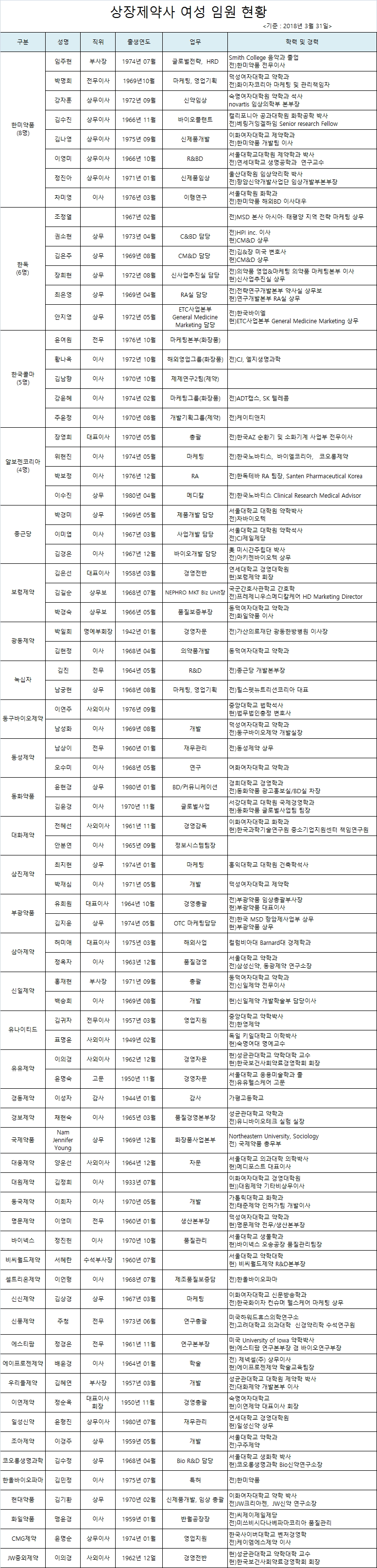 약업닷컴(www.yakup.com)이 상장 제약사의 2018년 3월말 기준 임원 현황을 분석한 결과, 80여명의 여성이 임원으로 활동하며 활발한 활동을 하고 있는 것으로 파악됐다. <지주회사 및 바이오제약사 제외>