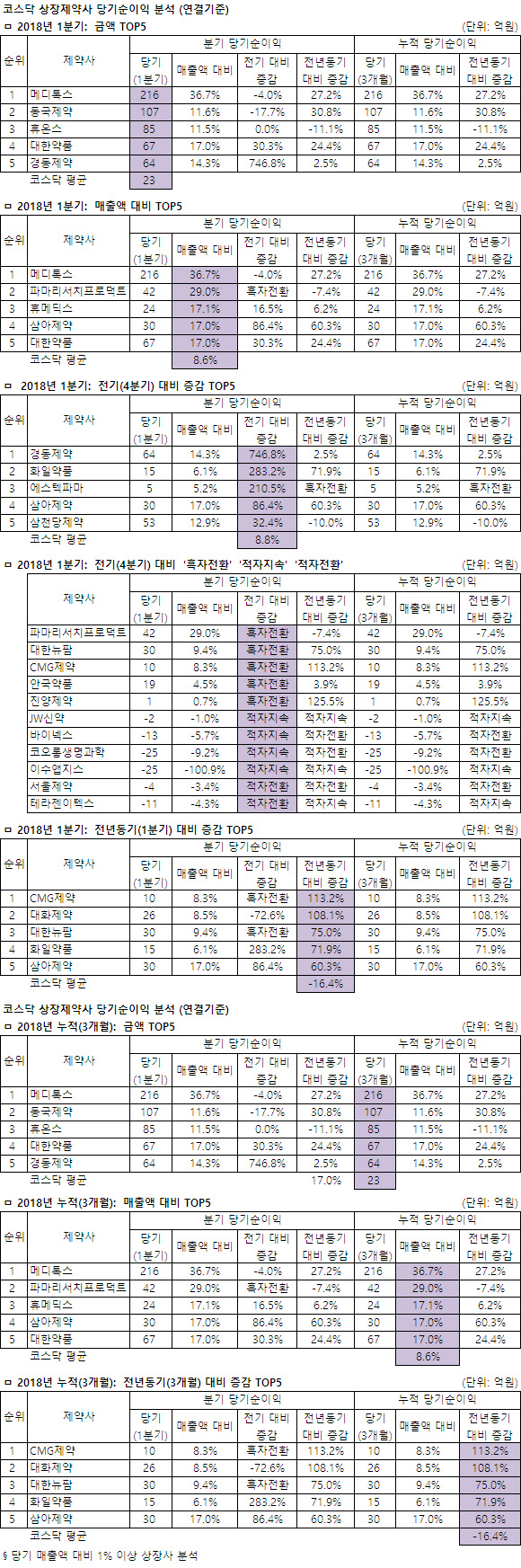 누적=당기순이익은 메디톡스가 200억을 동국제약이 100억을 넘으며 1,2위를 차지했다. 휴온스가 '톱5'에 합류했다(평균 23억)