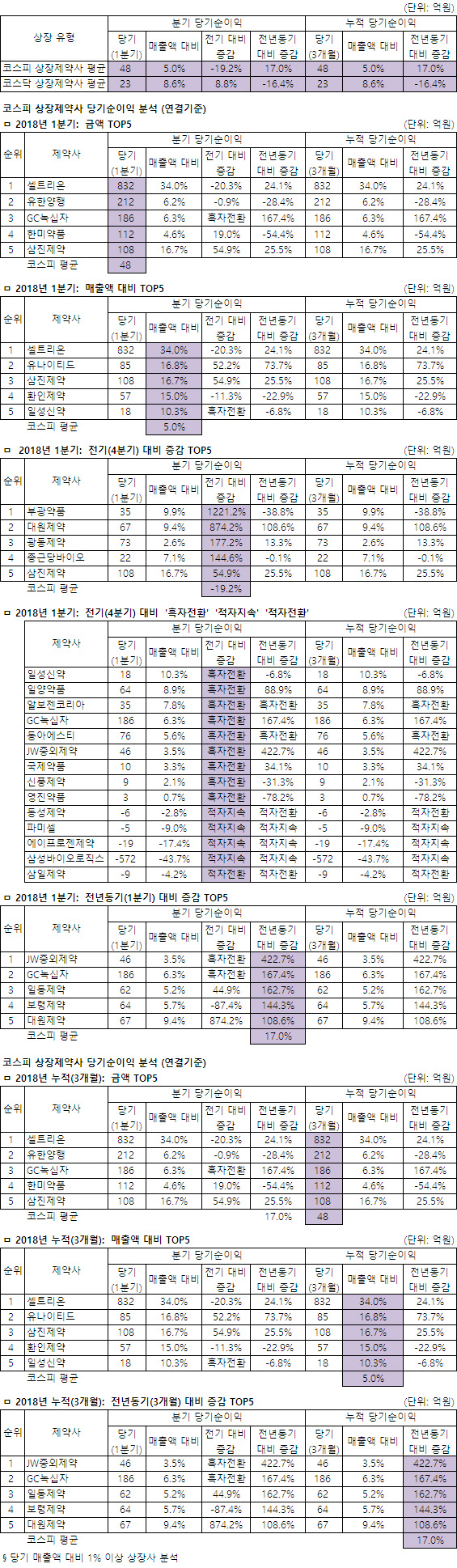 당기순이익이 가장 많은 제약사는 코스피는 셀트리온 코스닥은 메디톡스, 매출대비 비중이 가장 높은 제약사는 코스피는 셀트리온 코스닥은 메디톡스, 전년동기대비 증감률은 가장 높은 제약사는 코스피는 JW중외제약 코스닥은 CMG제약으로 각각 나타났다.