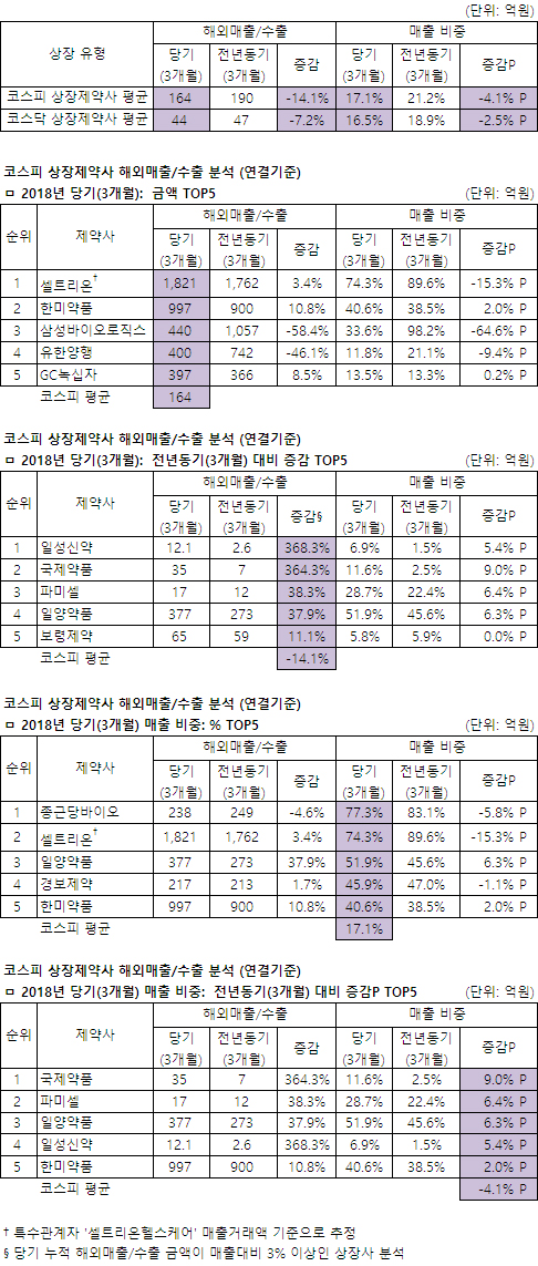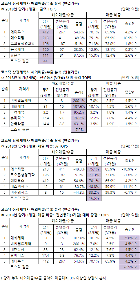 해외매출/수출액이 가장 많은 제약사는 코스피는 셀트리온 코스닥은 메디톡스, 전년동기대비 증감률이 가장 높은 제약사는 코스피는 일성신약 코스닥은 비씨월드제약, 매출대비 비중이 가장 높은 제약사는 코스피는 종근당바이오 코스닥은 에스티팜, 전년동기대비 증감p가 가장 높은 제약사는 코스피는 국제약품 코스닥은 대화제약으로 각각 나타났다.