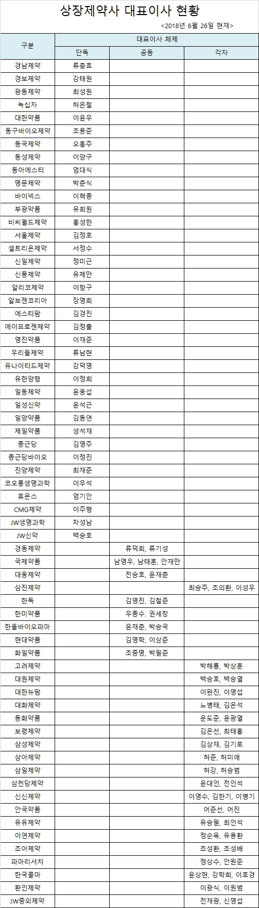 또 2인 이상 대표이사 체제를 운영하고 있는 제약사는 28곳(공동대표이사 8곳, 각자대표이사 20곳)으로 집계됐다.