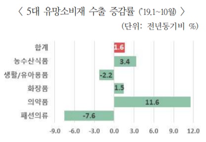 특히 의약품 분야의 10개월간 수출 증감율은 11.6%로 다른 5대 유망소비재 증가율 중 가장 높았다.