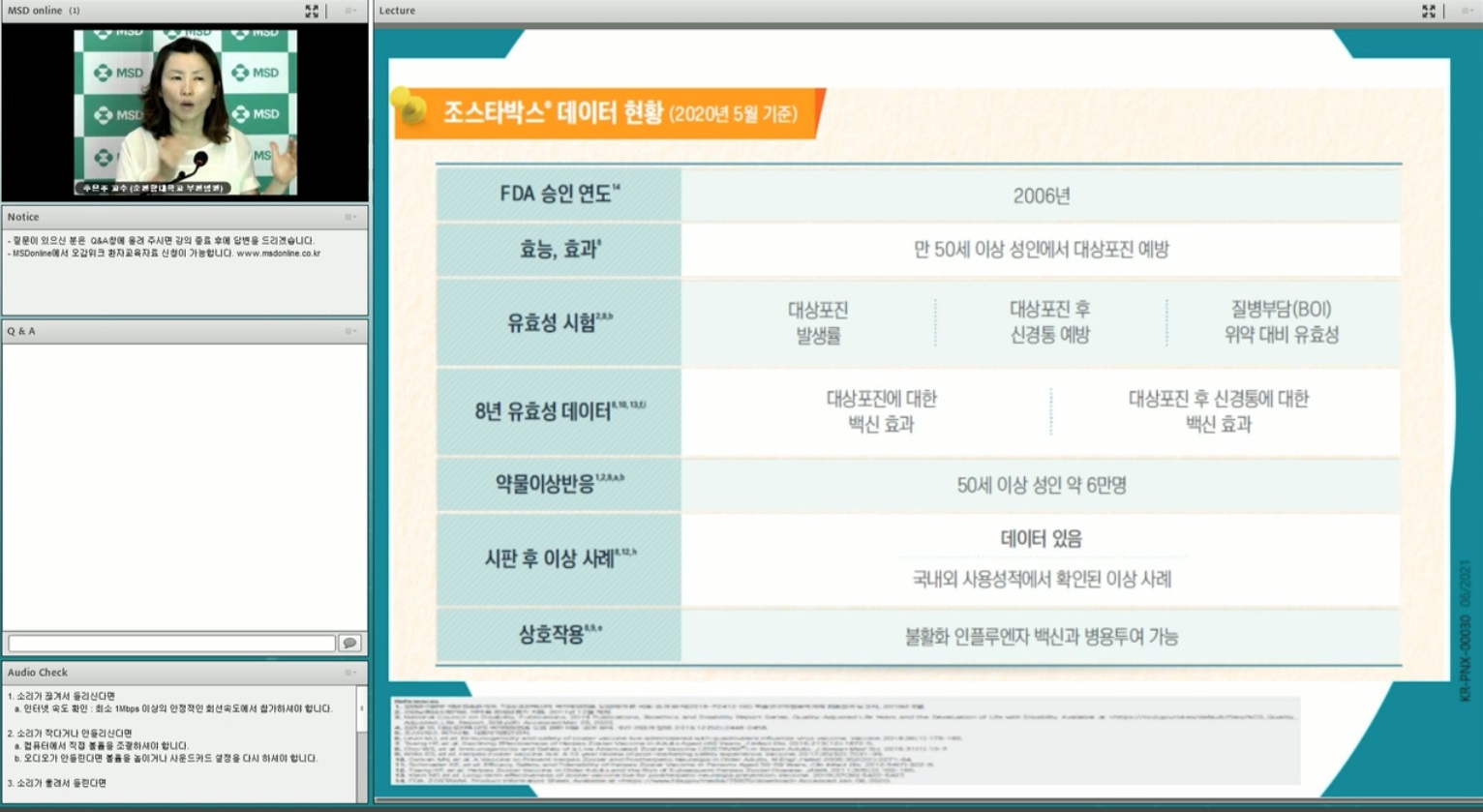백신 감 잡기에서는 감염학회에서 개정된 성인백신 가이드라인 및 대상포진 백신의 최신 지견을 다루었다. 또 이번 강의에서는 올해 FDA 승인 15주년을 맞이하는 ‘조스타박스’의 유효성 및 안전성 데이터도 언급 되었다.