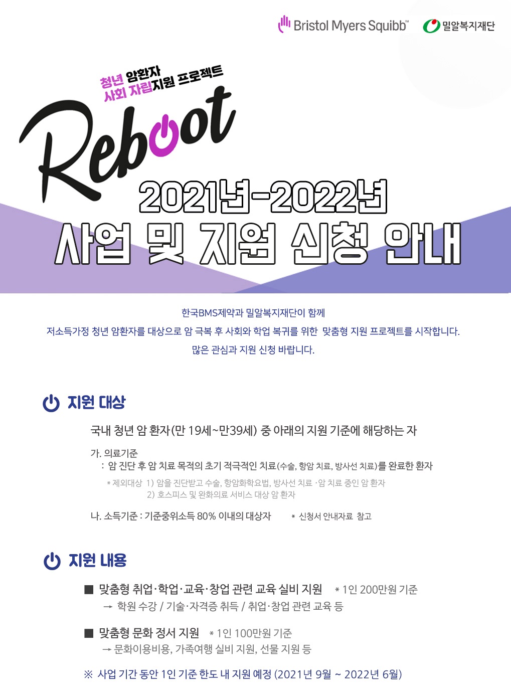 한국BMS제약(대표이사: 김진영)은 밀알복지재단(이사장: 홍정길)과 함께 진행 중인 청년 암 환자 사회 복귀 및 자립 지원 프로그램 ‘리부트(Reboot)’의 4기 지원자를 21일부터 모집한다.