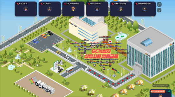 GC녹십자는 용인시에 위치한 GC녹십자 본사 및 R&D센터 전경과 신입사원 교육이 이뤄지는 교육장을 메타버스로 구현했다. 신입사원들은 본인의 아바타로 가상 연수원을 자유롭게 돌아다니며 동기들과 소통하고, 다양한 교육 프로그램에 참여했다. 메타버스를 활용한 교육은 기존 방식 대비 쌍방 교류가 원활히 이뤄질 수 있다는 점이 강점이다.