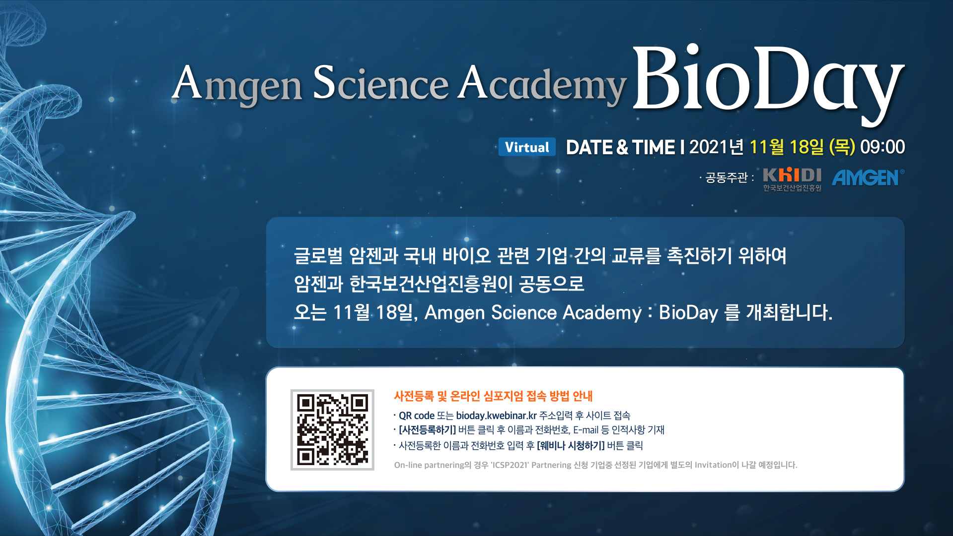 암젠코리아(대표 노상경)가 한국보건산업진흥원(원장 권순만)과 함께 혁신적인 바이오테크놀로지 기술을 보유한 국내 기업을 발굴하고 지원하기 위한 ‘암젠 사이언스 아카데미: 바이오데이(Amgen Science Academy Bioday) (이하 암젠 바이오데이)’ 온라인 심포지엄을 오는 18일 개최한다고 밝혔다.