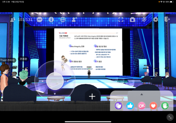 세미나 1부는 품질관리 솔루션 LIMS 및 EDMS 소개, 2부는 선진 GMP 정책을 위한 컴플라이언스 전략 주제 발표로 진행됐다. 이날 메타버스 플랫폼을 통해 세미나에 참석한 제약·바이오 관계자들은 의약품 생산에 필요한 품질관리 솔루션에 높은 관심을 보였다.