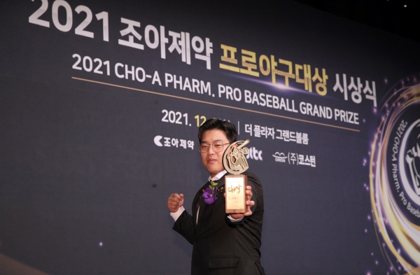 조아제약과 일간스포츠가 공동 제정한 '2021 조아제약 프로야구 대상' 시상식이 8일 오전 11시 30분 서울 중구 소공동 더플라자호텔 그랜드볼룸에서 열렸다. 방역 패스 시행과 장내 거리두기는 물론 참석 인원의 접촉을 최소화하기 위해 딜리버리 로봇이 시상자로 나서 눈길을 끌었다.