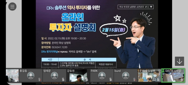 코로나19 확산으로 인해 실시간 온라인으로 진행된 이날 설명회는 지난 2021년 9월 한 달 동안 진행된 DRxS 약사 주주 모집에 참여했던 투자자들에게 그간의 사업성과 보고와 함께 앞으로 진행 예정인 사업 및 투자진행에 대한 공유를 위해 마련됐다.