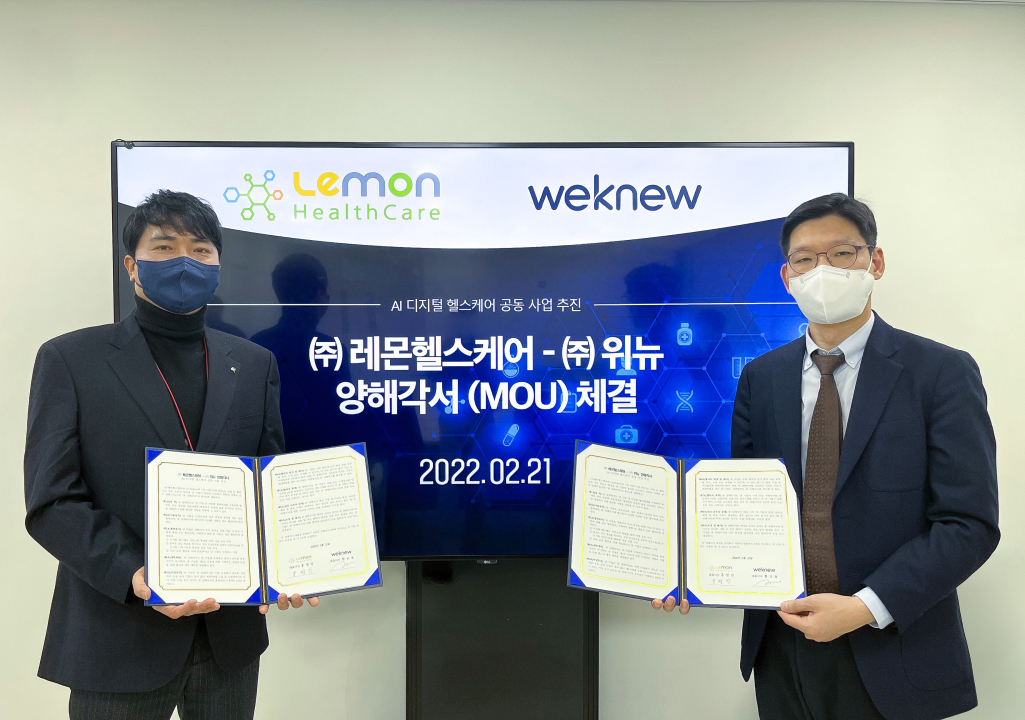 헬스케어 데이터 양방향 플랫폼 기업 레몬헬스케어(대표 홍병진)와 헬스케어 콘텐츠 플랫폼 기업 위뉴(대표 황보율)가 ‘인공지능(AI) 기반의 디지털 헬스케어 공동 사업 추진’을 위한 상호협력 양해각서(MOU)를 21일 체결했다고 전했다.