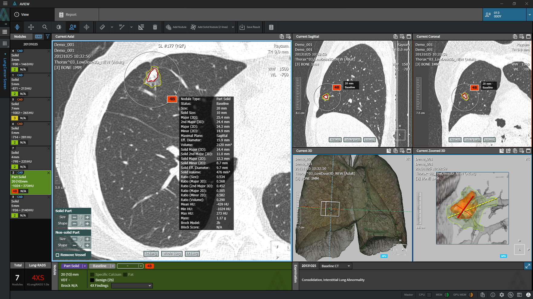흉부 CT영상에서 딥러닝을 기반으로 폐결절을 자동으로 분석하며, 주요 기능은 각 결절의 검출, 자동 측정, 추적 검사에서 결절 간 자동비교, LungRADS(Reporting and Data System) 기반 자동 리포팅까지 판독 전 과정이 자동으로 처리된다는 점이다.