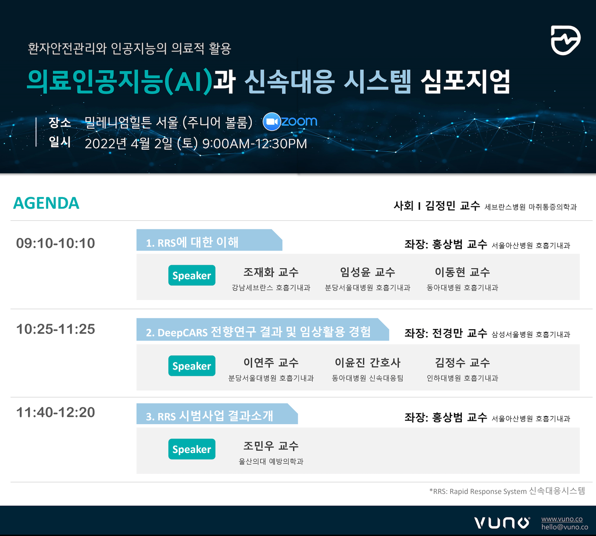 이번 심포지엄은 ▲신속대응시스템에 대한 이해 ▲뷰노메드 딥카스의 다기관 전향연구 결과 및 임상활용 경험 소개 ▲신속대응시스템 시범사업 결과 소개 등 3개 세션으로 나누어 진행될 예정이다. 홍상범 서울아산병원 호흡기내과 교수, 전경만 삼성서울병원 호흡기내과 교수가 각 세션의 좌장을 맡았으며, 세션별로 각 분야 전문가가 토론 및 발표에 참여한다.
