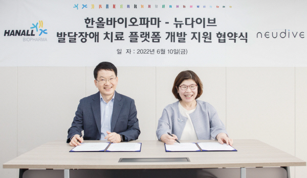 한올바이오파마가 발달장애 아동 및 청소년들을 위한 메타버스 기반 원격 사회성 치료 프로그램 및 맞춤형 인공지능(AI)을 개발하는 뉴다이브(대표 조성자)와 지원 협약을 체결했다고 13일 밝혔다.