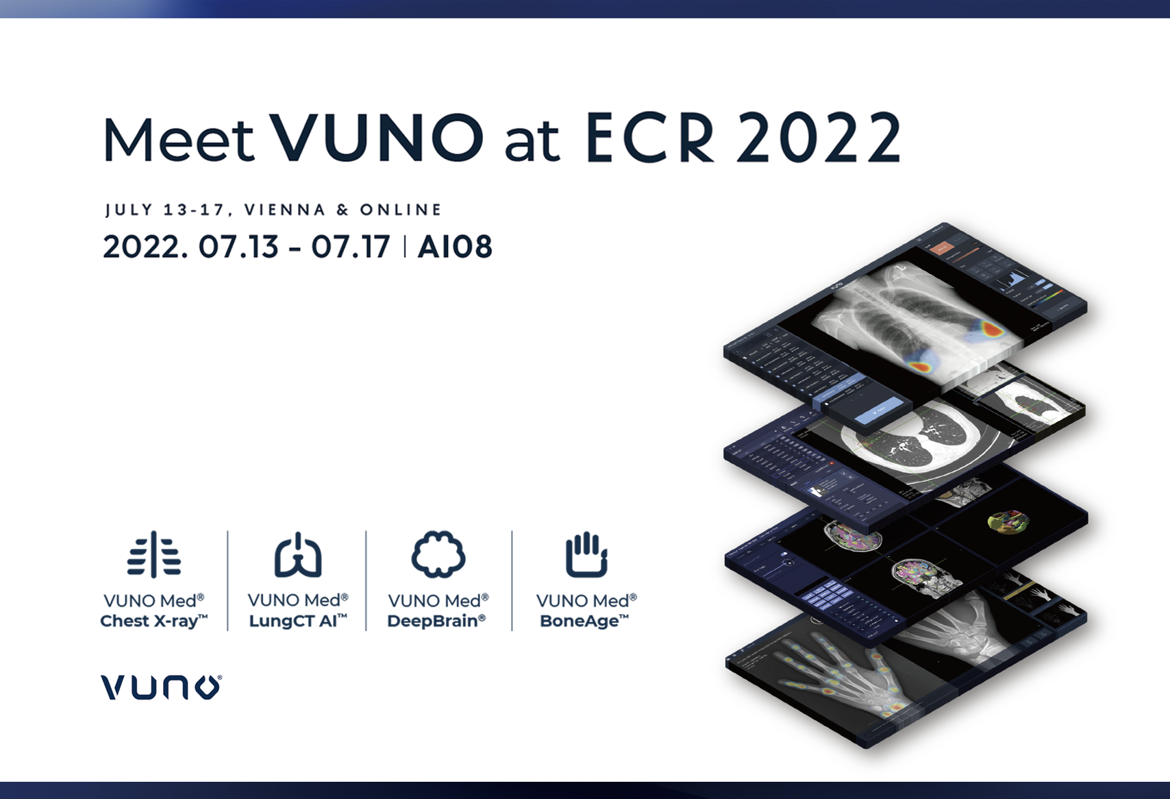 뷰노는 현장에서 부스 전시를 통해 유럽 CE 인증을 획득한 영상의학 분야 뷰노메드 솔루션 4개 제품을 선보인다. 전시 항목에는 ▲뷰노메드 흉부CT AI ▲뷰노메드 본에이지 ▲뷰노메드 체스트 엑스레이 ▲뷰노메드 딥브레인이 포함된다. 각 제품은 인공지능을 기반으로 X-ray, CT, MRI 등 의료영상을 분석해 의료진의 진단을 돕는 솔루션이다.