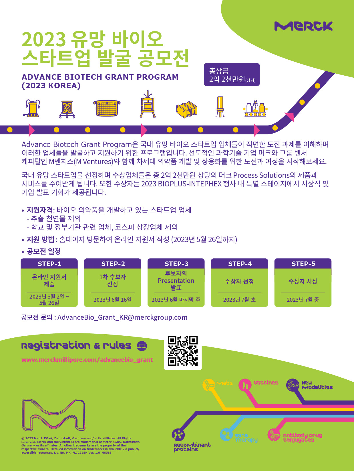 모든 제출물은 머크 그룹 산하 벤처 캐피털 회사인 M-Ventures와 머크의 바이오 프로세싱 전문가들이 심사할 예정이며, 심사를 통해 본선에 진출한 5개팀에게는 머크 제품과 서비스가 팀별로 제공될 예정이다.