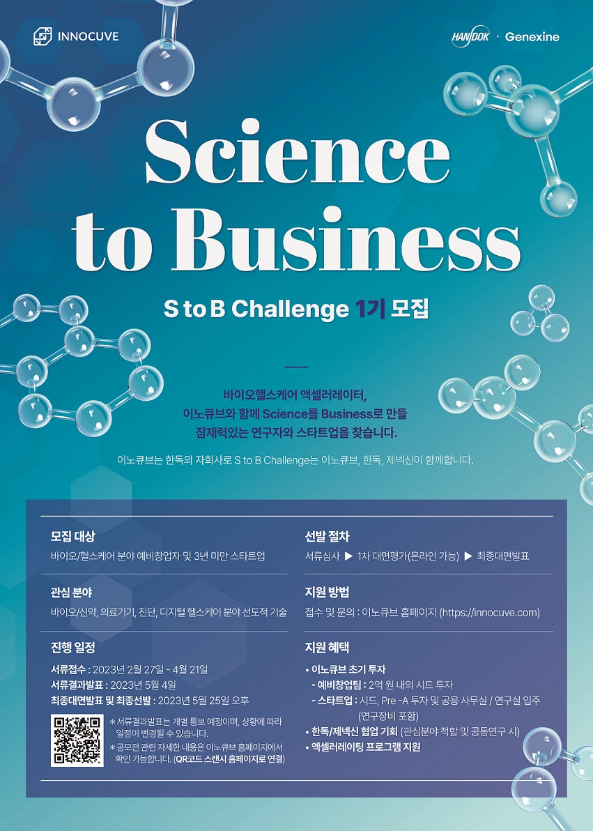 바이오헬스케어 액셀러레이터 기업, 이노큐브(대표이사 권소현)는 바이오헬스케어 분야에서 잠재력 있는 연구자 및 스타트업 발굴을 위해 ‘S to B(Science to Business) 챌린지 1기’를 모집한다고 3일 밝혔다.