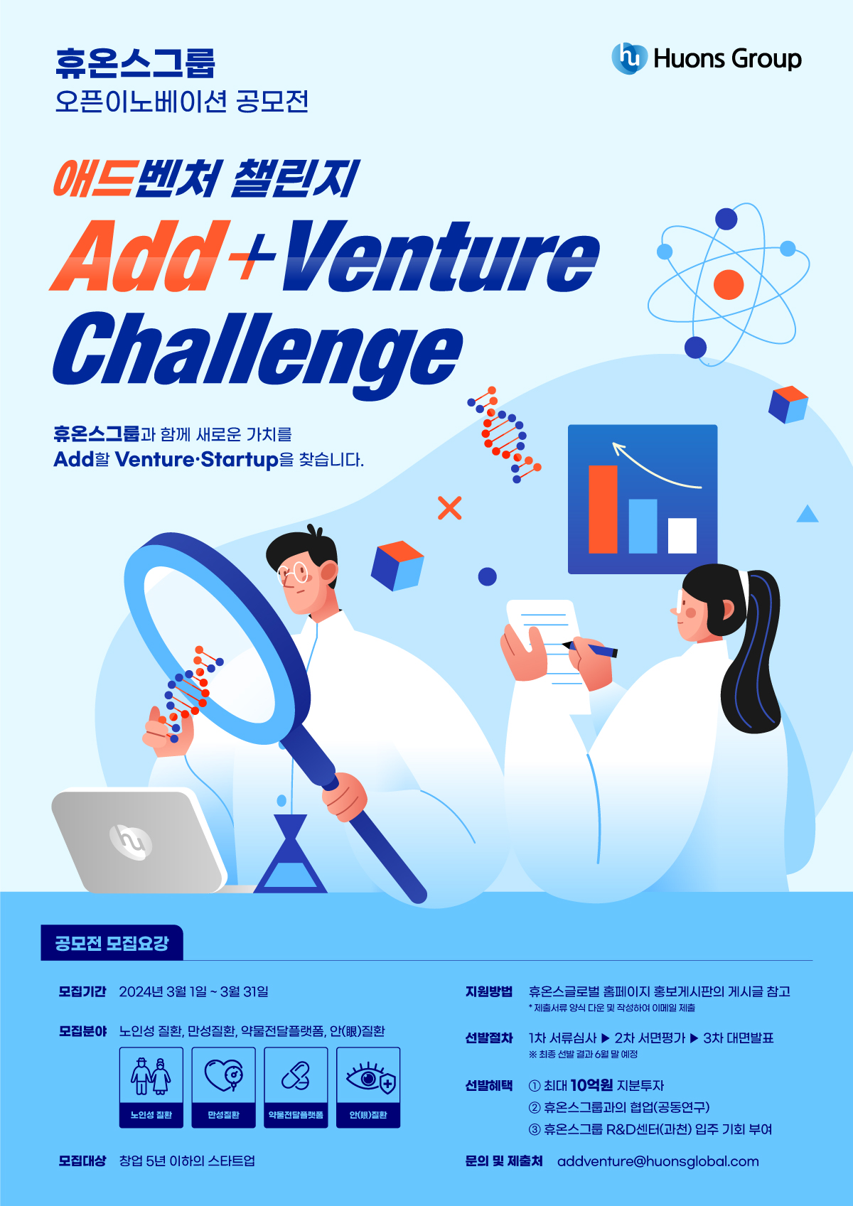 ㈜휴온스글로벌(대표 송수영)이 내달 1일부터 한 달간 유망 제약바이오 스타트업을 발굴하고 성장을 지원하기 위한 ‘애드벤처(Add+Venture) 챌린지’를 개최한다.