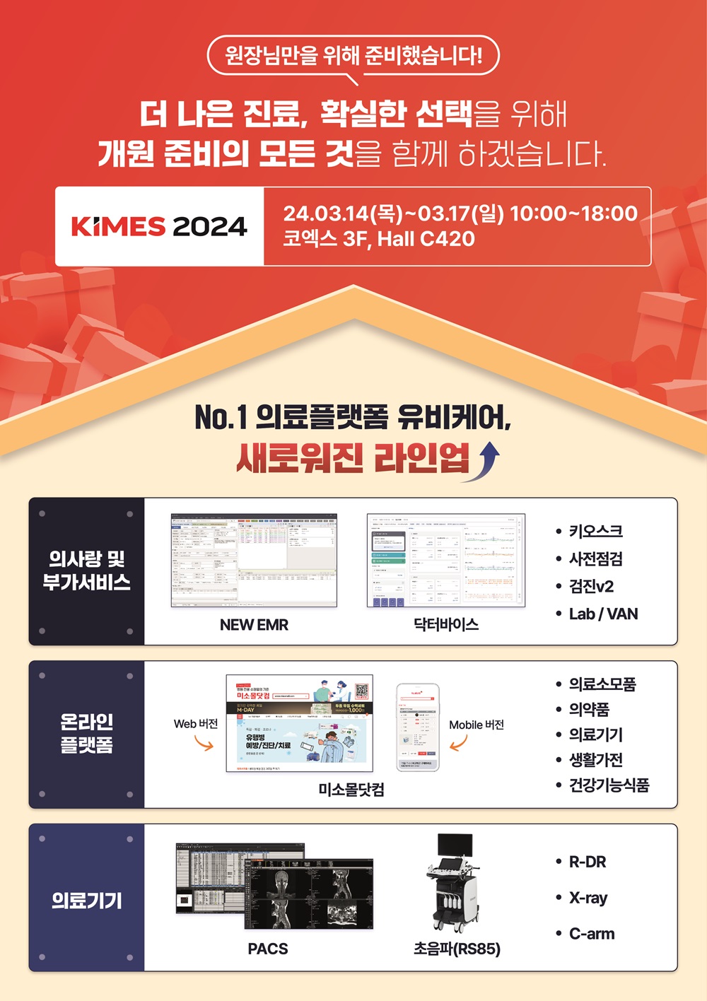 이번 전시에서 유비케어는 “더 나은 진료 확실한 선택, 의사랑!”을 슬로건으로 병·의원에서 필수적인 업무를 효율적으로 처리하고 동시에 환자를 유연하게 연결해 의료진에게는 환자 진료의 편의를, 환자에게는 병·의원 이용편의를 제공하는 핵심 라인업을 공개한다.