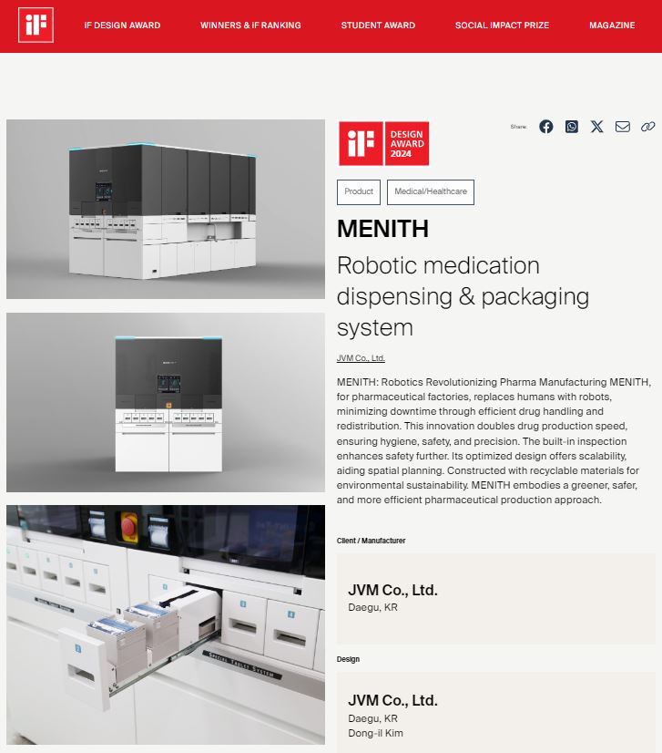 메니스는 로봇팔을 적용한 혁신성과 확장성, 공간 효율을 고려해 디자인한 ‘차세대 조제장비’라는 점에서 우수한 평가를 받은 것으로 알려졌다. iF 디자인 공식 홈페이지에서도 메니스의 수상 소식을 전하며 관련 내용을 소개했다.