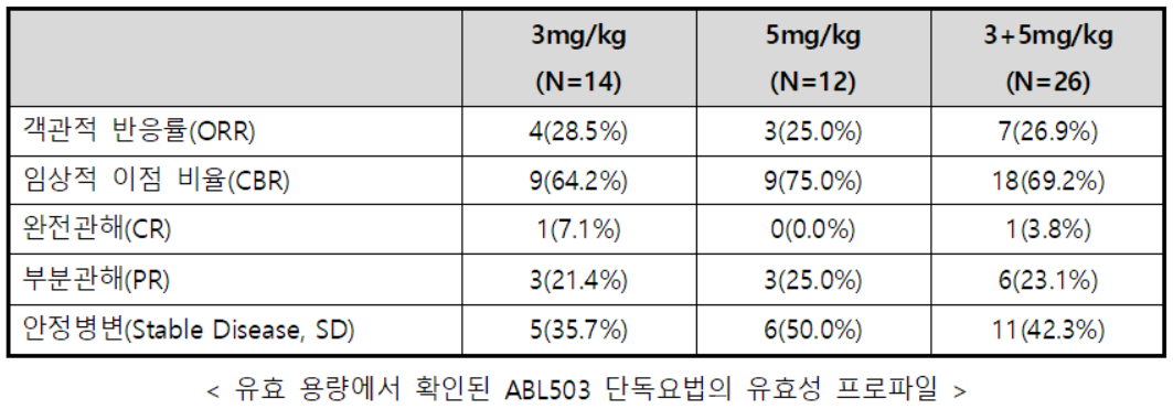 7명의 CR 및 PR 환자들은 모두 유효 용량인 3mg/kg과 5mg/kg을 투여받았으며, 이에 따라 유효 용량에서 확인된 ABL503의 객관적 반응률(Overall Response Rate, ORR)은 26.9%(7/26), 임상적 이점 비율(Clinical Benefit Rate, CBR)은 69.2%(18/26)로 나타났다. 또한, 바이오마커 분석 결과, CR 및 PR 환자에서 기억 T 세포(Memory T Cells)가 장기간 활성화되는 것으로 확인됐다고 회사는 덧붙였다.