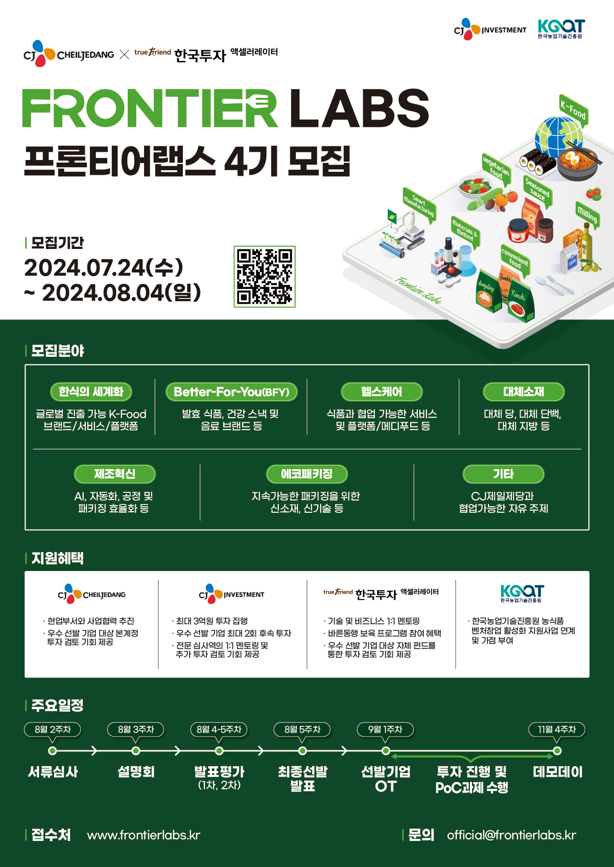 한국투자액셀러레이터가 CJ제일제당과 오픈이노베이션 프로그램 ‘프론티어랩스 4기’에 참여할 유망 스타트업을 7월 24일 부터 다음달 4일까지 모집한다.