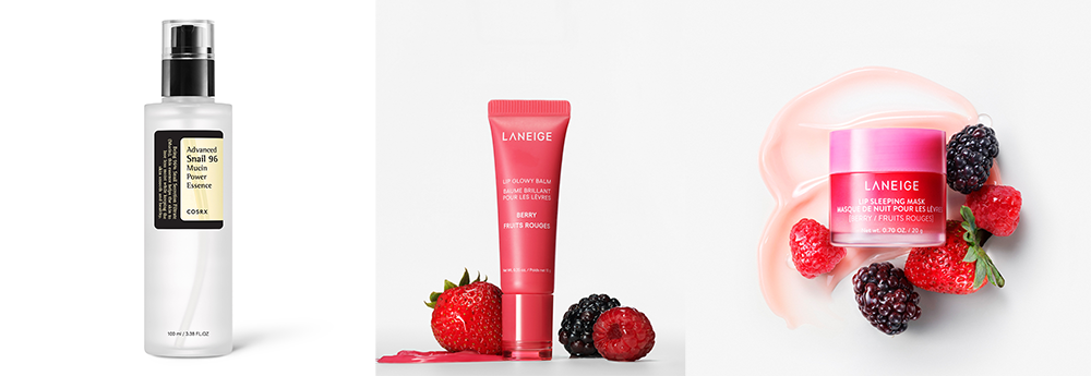 ▲ (왼쪽부터) 아마존 프라임데이에서 뷰티&퍼스널 케어 부문 1위를 차지한 코스알엑스 ‘어드벤스드 스네일 96 뮤신 파워 에센스’와 2위 라네즈 ‘립 글로이 밤-베리향’, 3위 라네즈 ‘립 슬리핑 마스크-베리향’. ⓒ아모레퍼시픽