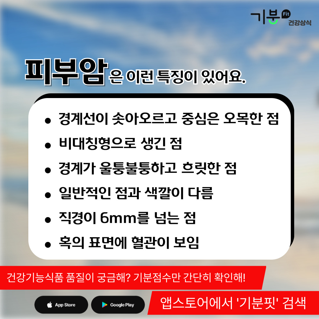 그 외에 경계선이 울퉁불퉁하고 흐릿하거나 점의 색깔이 특이할 때, 점의 직경이 6㎜를 넘을 때 피부암을 의심해봐야 한다.