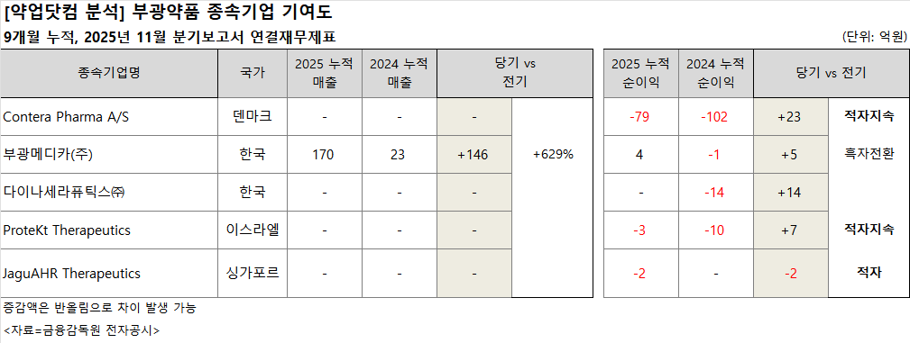종속기업 기여도에서는 국내 부광메디카가 누적매출 170억 원으로 전기대비 629% 상승했고, 순이익도 4억 원으로 흑자전환을 이뤘다.