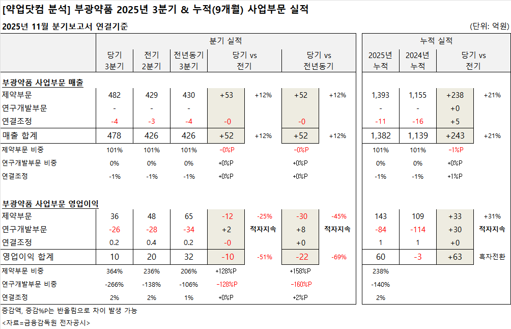 사업분문별 제약부문 영업이익은 36억 원으로 전년동기 대비 45% 감소했지만, 누적 영업이익은 143억원으로 전년동기 대비 31% 증가했다.