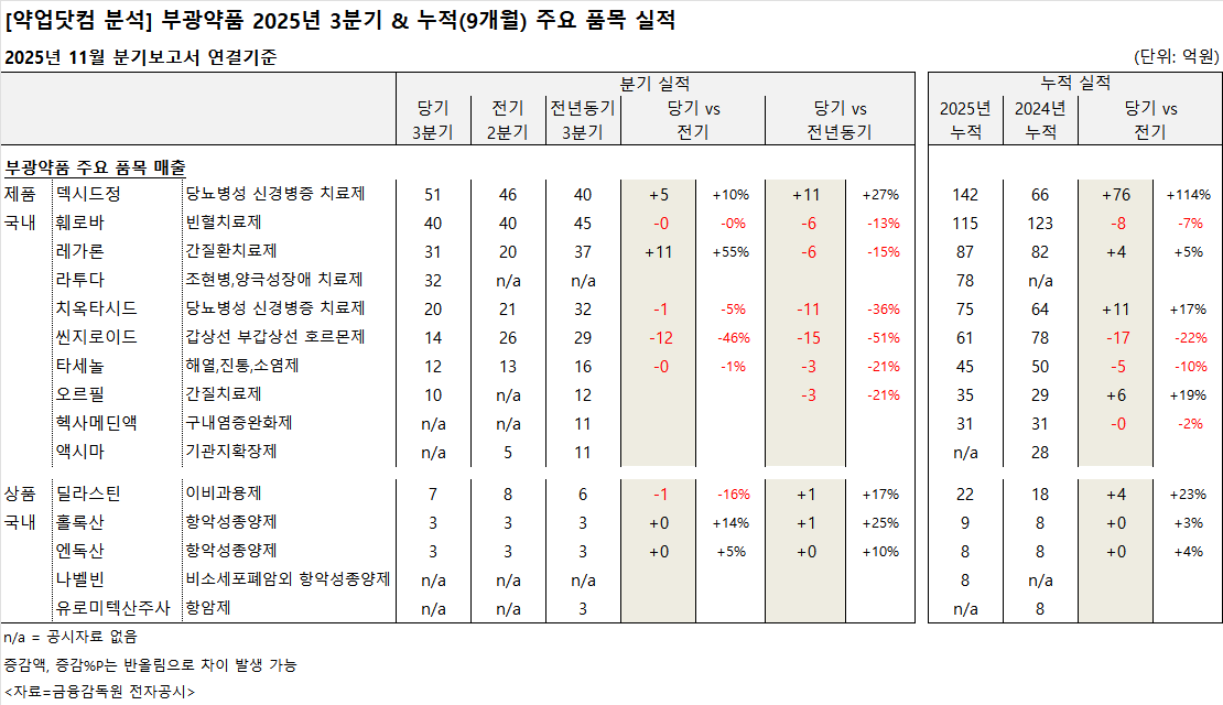 이어 △빈혈치료제 훼로바 3분기 매출 40억 원, 누적 115억 원 △간질환치료제 레가론 매출 31억 원, 누적 87억 원 △조현병, 양극성장애 치료제 라투다 매출 32억 원, 누적 78억 원 △당뇨병성 신경병증 치료제 치옥타시드 매출 20억 원, 누적 75억 원 △갑상선 부갑상선 호르몬제 씬지로이드 매출 14억 원, 누적 매출 61억 원 △해열, 진통, 소염제 타세놀 매출 12억 원, 누적 매출 45억 원 △간질치료제 오르필 매출 10억 원, 누적매출 31억 원 △구내염증완화제 헥사메딘액 △기관지확장제 엑시마 순이었다.