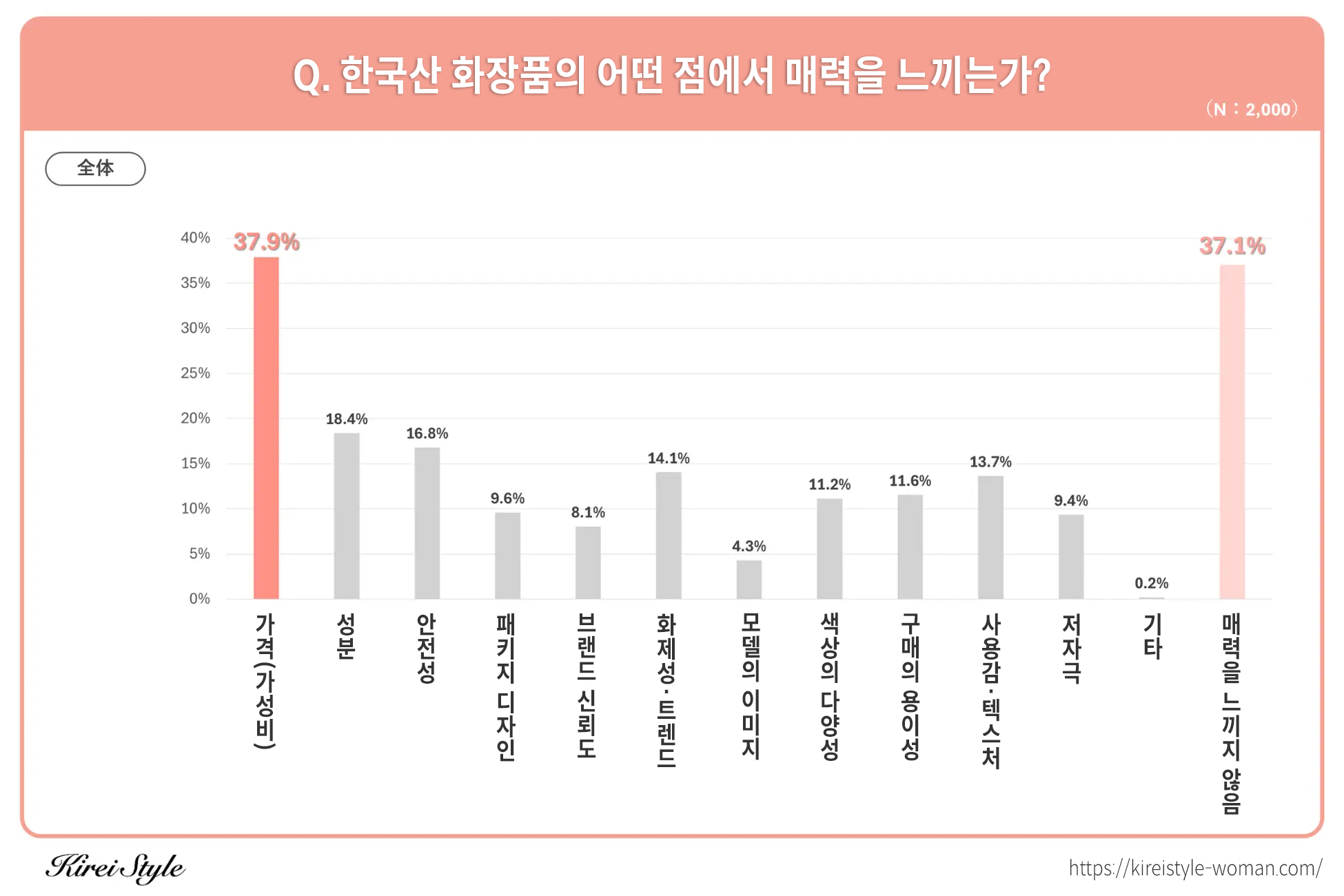 이번 조사에선 K-뷰티에 매력을 느끼고 있는 응답자의 상당수가 높은 가성비를 장점으로 꼽았다. 37.9%의 응답자가 K-뷰티의 매력 포인트로 '가격'을 꼽았다. 합리적인 가격대가 일본 소비자에게 접근 장벽을 낮추는 역할을 하고 있는 것으로 나타났다.