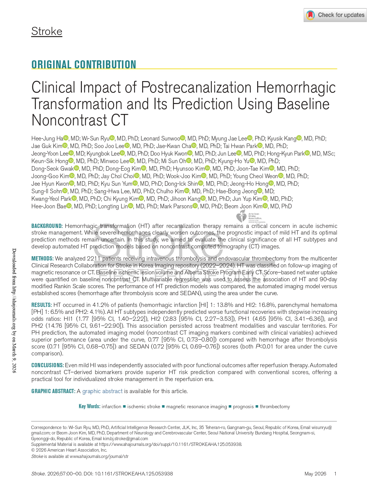 연구에서는 혈전용해술 또는 혈전제거술 이후 발생하는 출혈성 변화가 환자 회복에 미치는 영향과, 이를 시술 전에 예측할 수 있는 가능성을 동시에 평가했다.