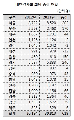 2012년 신상신고 회원수가 3만 194명이었다는 점을 감안하면 619명(2.0%) 늘어난 수치다. 지난 2012년 처음으로 3만명을 넘어선 신상신고 약사회원은 2년째 3만명을 유지하게 됐다.