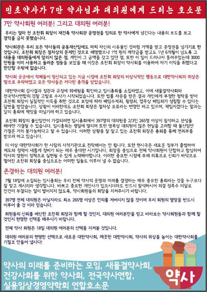 '민초약사가 7만 약사님과 대의원에게 드리는 호소문'이란 제하로 대한약사회 기관지에 전면 광고로 실린 호소문에서는 "조찬휘 회장이 재건축 약사회관 운영권을 임의로 한 약사에게 넘긴다는 내용의 보도를 보고 경악을 금치 못했다"며 '신축회관 운영권 1억원 가계약'에 대한 회원들이 심정을 전했다.