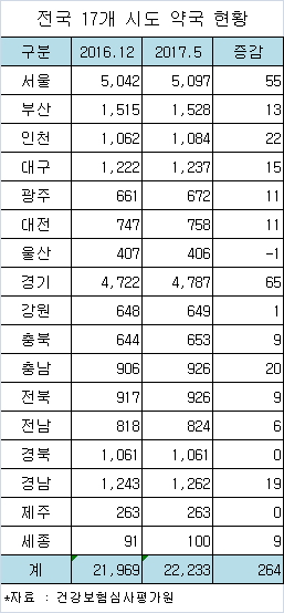 건강보험심사평가원에 따르면 2017년 5월말 현재 전국 약국수는 2만 2,333개소로 올해 들어 264곳의 약국이 늘어났다.