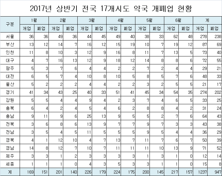 서울은 올 상반기중 238개 약국이 폐업을 했고 새롭게 278곳이 문을 열었다. 개업이 페업보다 40곳 많았다.