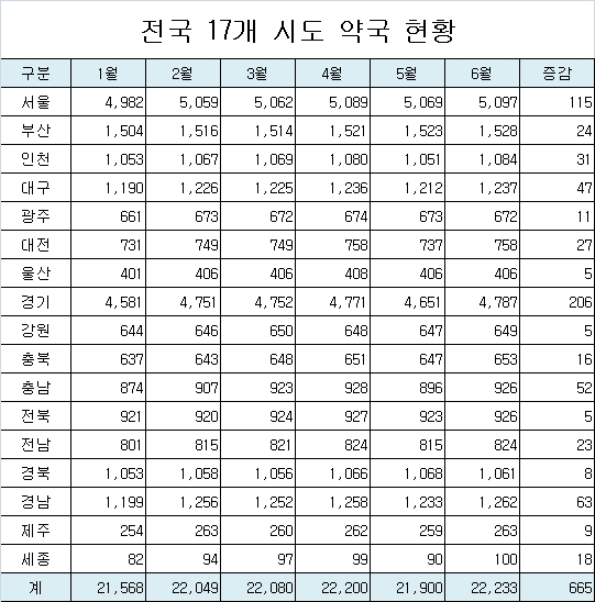1월 2만 1,568곳에서 2월에 2만 2천개 약국을 넘은 이후 3월에 2만 2,080곳, 4월에 2만 2,200곳까지 증가하다 5월에는 2만 1,900곳으로 300곳으로 줄었다. 이후 6월에는 2만 2,233곳으로 5월 대비 333곳 증가했다.