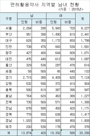 약사면허 등록자중 여성은 1만 9,332명, 남성은 1만 3,874명으로 여약사와 남약사의 비중은 58 : 42 였다. 면허활용 약사 10명중 6명은 여약사라는 것을 의미한다.