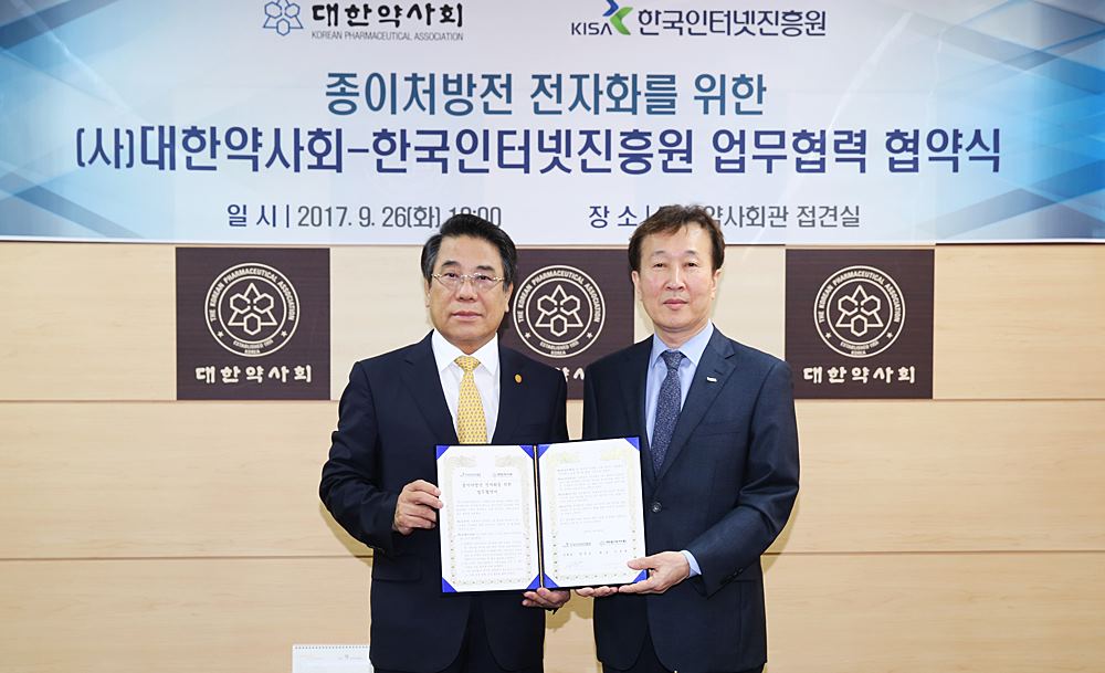 대한약사회(회장 조찬휘)는 병원·약국 간 처방전달 업무의 효율성을 증대시키고 대국민 편의성 향상을 위해 한국인터넷진흥원(KISA)과‘종이처방전 전자화를 위한 업무협약(MOU)’을 26일 체결했다.