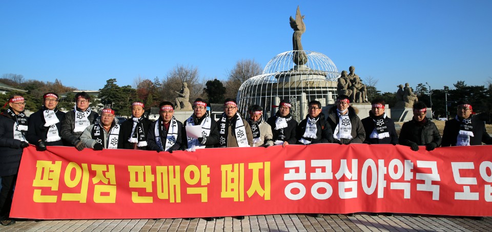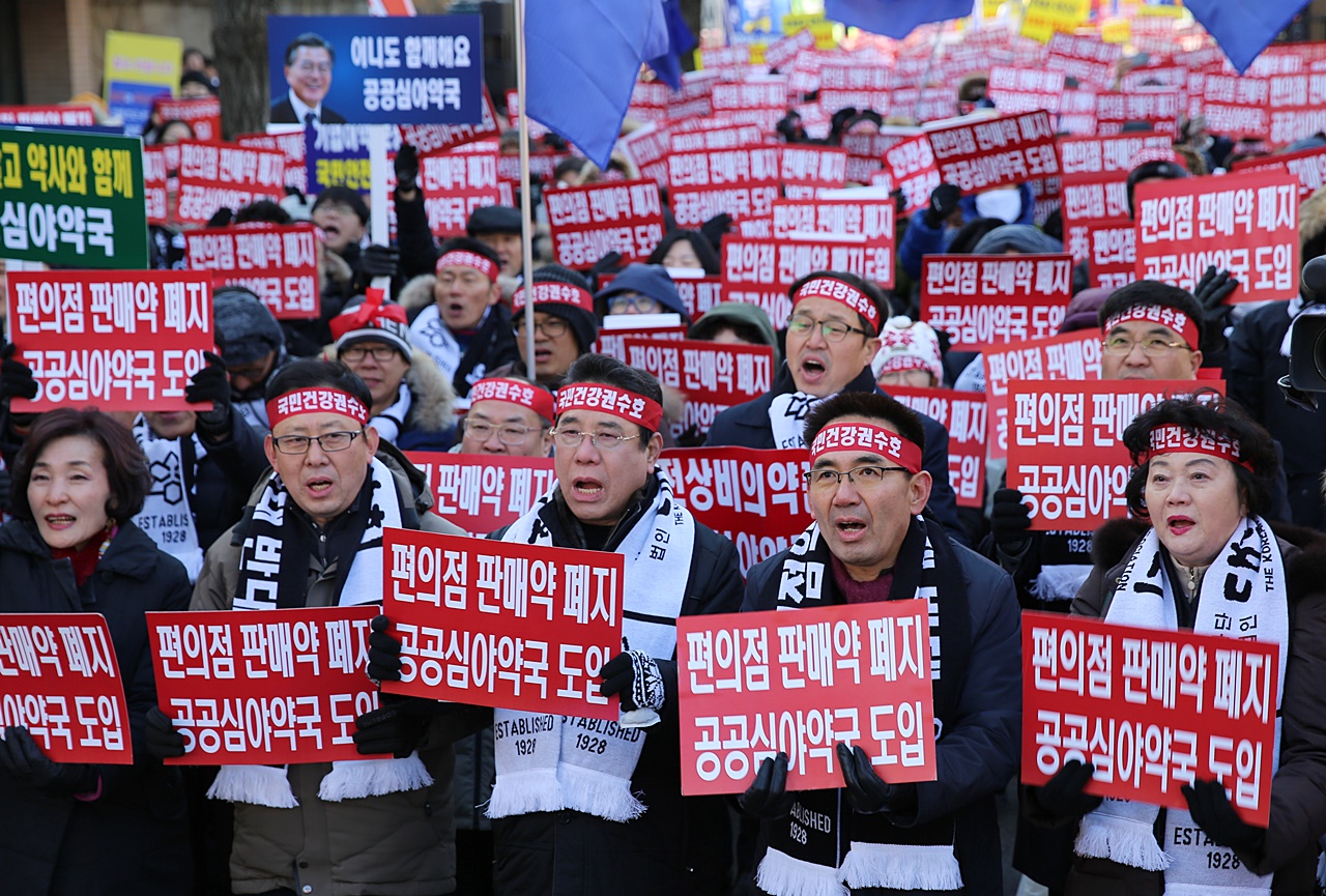 대한약사회(회장 조찬휘)가 17일 1천여명이 참여한 가운데 편의점 판매약 확대를 반대하는 전국 임원궐기대회를 청와대 앞에서 진행했다.