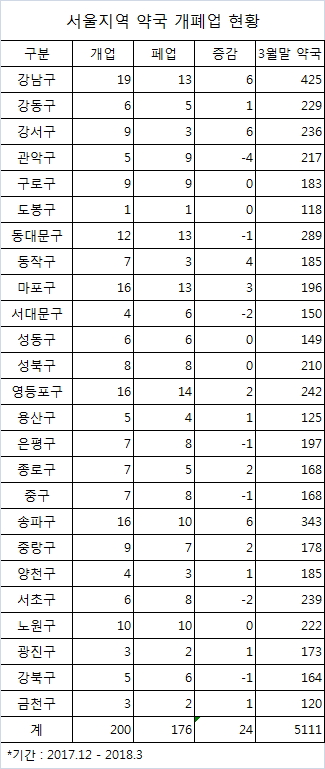 지난 3개월간 서울지역에서 약국이 가장 많이 늘어난 곳은 강남구였다. 13개 약국이 문을 닫았지만 19개 약국이 새로 문을 열어 6곳이 늘어났다.