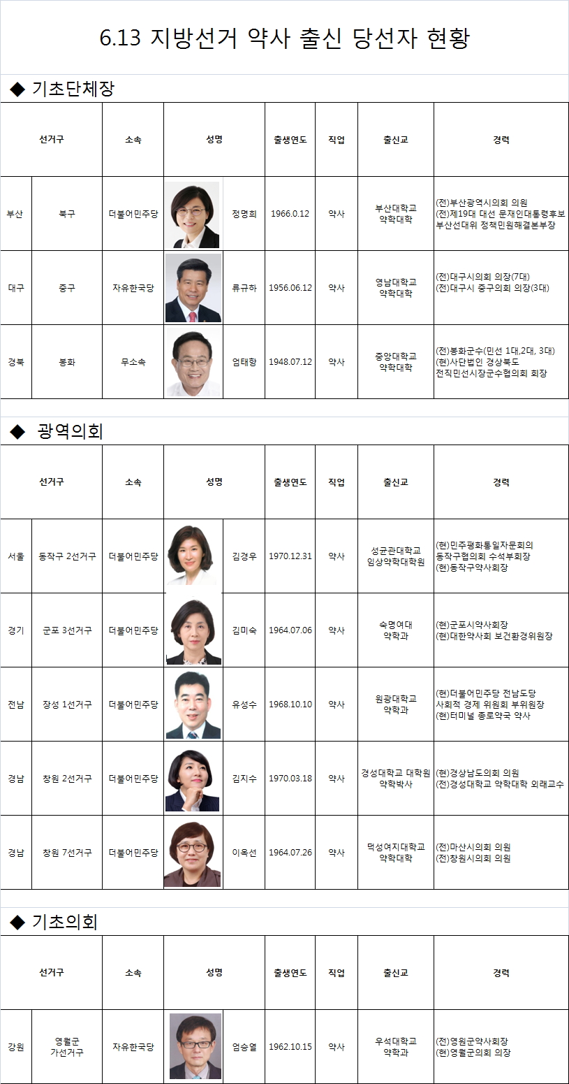 기초단체장 선거에서는 약사출신인 부산 북구 정명희 후보, 대구 중구 류규하 후보, 경북 봉화군 엄태항 후보가 당선됐다.