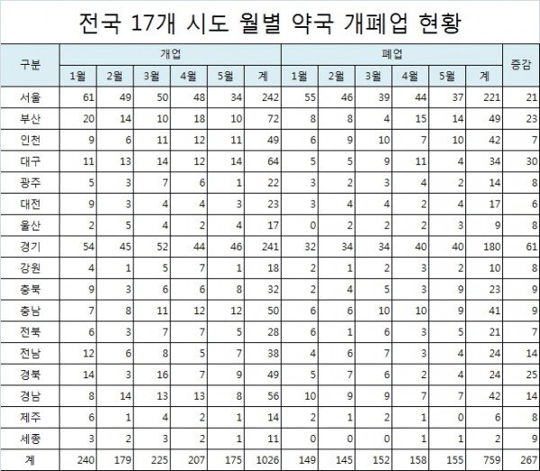 건강보험심사평가원이 집계한 요양기관 현황에 따르면 올해 들어 지난 5개월간 전국 17개 시도에서 새롭게 개업을 한 약국은 1,025곳으로 파악됐다.