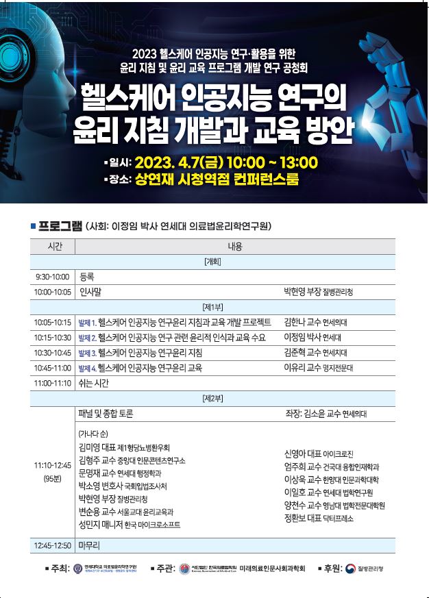 이번 공청회 1부에서는 △헬스케어 인공지능 연구윤리 지침과 교육 개발 프로젝트(연세의대 김한나 교수) △헬스케어 인공지능 연구 관련 윤리적 인식과 교육 수요(연세대 이정임 박사) △헬스케어 인공지능 연구윤리 지침(연세치대 김준혁 교수) △헬스케어 인공지능 연구윤리 교육(명지전문대 이유리 교수) 주제로 구성했다. 이어 2부에서는 연세의대 김소윤 교수가 좌장을 맡아 관련 발표들에 관한 토론이 진행될 예정이다.