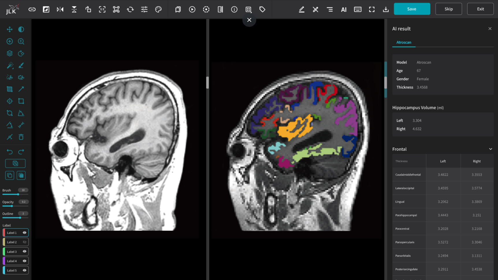 제이엘케이 뇌졸중 AI 솔루션과 시너지 효과도 기대된다. 환자 CT, MRI를 판독해 제공되는 ▲뇌졸중 유무 ▲뇌졸중 유형 ▲병변 크기 및 부피 ▲중증도 ▲혈관 폐색 ▲혈류량 정보 등 정량적 지표에 뇌 영역 분류 시스템이 더해지면 보다 자세한 치료 및 재활 계획을 수립할 수 있어 뇌졸중의 후유 장애를 최소화할 수 있기 때문이라고 회사 측은 설명했다.