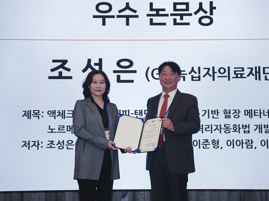 이번 학술대회에서 수상한 부문은 우수논문상으로 ‘액체크로마토그래피-탠덤질량분석법 기반 혈장 메타네프린과 노르메타네프린 정량검사를 위한 전처리자동화법 개발 및 평가’(▲조성은 센터장), 우수연제상으로는 ‘한국인 성인의 혈청 부갑상선호르몬(PTH) 참고 범위 평가’ 연구(▲최리화 전문의), 마지막으로 데이터분석상으로 미국 국민건강영양조사(NHANES)결과를 이용한 한국인의과불화화합물(PFAS) 노출 수준 평가(▲이준형 전문의)이다.