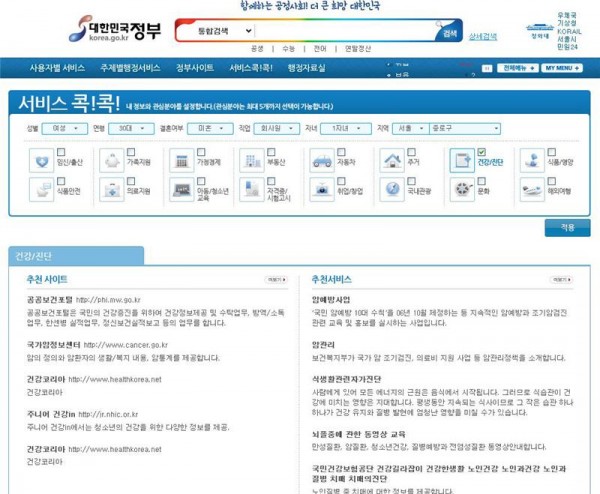 정부포털의 ‘서비스 콕콕’ 메뉴에서 ‘건강/진단’ 서비스를 이용하면 성(性), 연령, 지역, 결혼 여부 등에 따라 맞춤 추천 건강 정보를 알 수 있으며 건강과 질병 진단에 대한 300개 이상의 사이트와 추천 서비스를 일목요연하게 자동으로 검색해 보여주고, 자신이 살고 있는 지역의 지역 건강정보도 볼 수 있다.