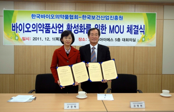 한국보건산업진흥원(원장 고경화)과 한국바이오의약품협회(회장 김명현)는 지난 1일 바이오의약품산업 활성화를 위한 업무협약(MOU)을 체결했다.
