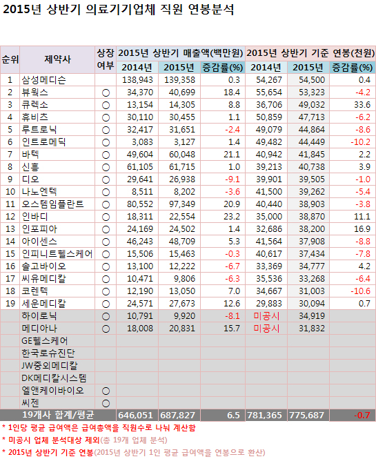 보건의료 분석평가 전문사이트인 팜스코어가 기업들의 공시자료를 토대로 2015년도 상반기 현재 19개 의료기기업체의 1인 평균 연봉을 분석한 결과다.