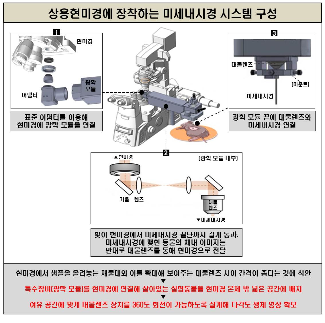 좁은 재물대에 올릴 수 없는 실험동물을 현미경 본체 밖 여유 공간에 두면서, 미세내시경을 동물 장기에 넣고 이와 연결된 현미경으로 내부를 직접 관찰할 수 있게 만든 것이다.